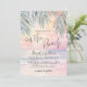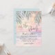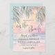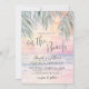 Simple Seaside Watercolor Summer On The Beach Wedding Invitation. The background blends a soft pink, purple, blue, and tan sunset sky that transitions gently into the ocean water and sandy shoreline, with the beach set at a slight angle for a modern coastal feel. The artwork keeps a calm, slightly abstract look as the waves meet the sand. Palm leaves rest at the top above the horizon, adding a light tropical touch without taking over the scene.