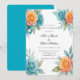 A watercolor illustration of a romantic bouquet of roses in pastel colors. The arrangement features six large roses in orange, and teal, with each rose rendered in a detailed spiral pattern. The roses are accompanied by delicate green leaves and stems. A light blue satin ribbon with a flowing bow ties the stems together at the base. The bouquet is set against a pure white background, creating a clean, elegant composition. The roses are arranged in a circular pattern, with the peach-orange colored roses positioned at the outer edges and the blue and teal roses interspersed throughout. The illustration has a soft, watercolor-like quality with subtle shading and highlights on each petal. The leaves are rendered in various shades of sage green with delicate veining details. The stems are thin and green, emerging from beneath the ribbon bow.
