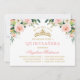 Elegant Watercolor Pink Blush White Floral Mis Quince Anos Quinceanera Invitation includes pink roses, white flowers and greenery leaves. Pink Back. Calligraphy Script Name. Gold Tiara Crown.