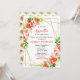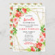 This fun and whimsical baby shower invitation features watercolor watermelon, pomegranate, strawberries, cherries and foliage on a gold geometric frame. The text combines handwritten script and serif fonts for a stylish and modern look. This is perfect for a summer rustic baby shower.