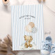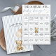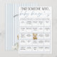 Personalize this adorable light dusty blue, beige, and white "We Can Bearly Wait!" teddy bear theme baby boy shower BINGO card featuring featuring pre-filled squares with cute "Find Someone Who" wording, a sweet watercolor teddy bear wearing a blue bow on the front, with custom mommy's name, shower date, and teddy bear holding checkerboard balloons over blue ticking pinstripes on the back. It's the cutest on-theme fun and interactive get-to-know-you game! Discover the matching invitation, diaper raffle card, books for baby card, favor stickers & tags, decor and more in the full collection above ♥ Custom design requests, colors, product collection additions, and template questions are always welcome - click the "message" button or email direct (with a quick response time!): contact@figandlilyco.com. Design is lovingly created by Fig and Lily Studios - sending blessings and thanks for being here with us ♥