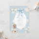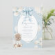 Sweet little bear in a white coat and blue satin bow flowing over the event details. White hydrangeas and a blue and white shabby chic polkadot background, We’ve used lovely fonts and scripts done in coordinating colors baby shower invite. Hydrangeas.