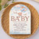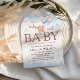 A sweet baby shower design featuring an adorable teddy bear holding pastel blue and blush balloons beneath soft clouds and star accents. The playful “We Can Berly Wait” wording adds a fun and memorable touch, while the arched layout gives the design a modern, elegant look. Perfect for celebrating a baby boy or a soft pastel baby shower theme with charming watercolor style.