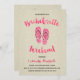 Un mignon invitation de fête de bachelorette pour une escapade de week-end, avec de jolies calligraphies d'aquarelle rose, des sandales de parties scintillant rose, et un arrière - plan de plage, de grains de bois brun clair.