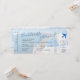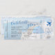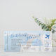 Santorini Grèce Bachelorette Party Week-end Voyage Invitation et infos de voyage modèle avec une ligne d'horizon de l'océan avec le bâtiment de la coupole bleue sur une carte d'embarquement billet d'avion carte de voyage thème. Vous pouvez modifier tout le texte et le libellé de votre voyage sophistiqué Santorini Greek Week pour les filles en escapade.
