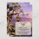 Whimsical wedding invitation featuring a painting of a lavender landscape at sunset with lantern and love birds. On the back is a QR code template with RSVP options. Perfect for a "Nothing fancy, just love" casual wedding celebration.