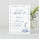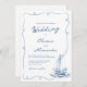 This whimsical hand drawn white and navy blue nautical wedding invitation features a squiggly frame with a sailboat in the lower right corner.