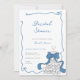 Vous planifiez une douche de mariée bleue fantasque? Commencez par dessiner à la main quelque chose de bleu nuptiale invitations, qui sont la façon parfaite de célébrer la mariée-à-être avec un quelque chose de bleu avant le thème de la douche nuptiale I Do. Ces invitations de wedding shower bleu lunatique sont personnalisables, vous pouvez donc ajouter tous les détails sur la douche nuptiale quelque chose de bleu. L'invitation à la douche nuptiale AMRIN whimsical quelque chose de bleu présente un design fantaisiste avec une bordure en ruban dessinée à la main et une tour de champagne avec un grand arc bleu et des rubans, jumelée avec des polices manuscrites et serif dans une nuance de bleu et gris foncé pour ajouter un intérêt visuel à vos invitations de douche nuptiale bleue. Cet invitation wedding shower dessiné à la main donne le ton à votre douche nuptiale bleu ludique quelque chose.