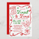 Celebrate the season with this whimsical Christmas party invitation featuring hand-drawn red and green illustrations and lettering on a white background. The design showcases Santa lounging in a martini glass beside his list, surrounded by stars and a flowing ribbon frame around your party details. “Tinsel & Tinis” appears in a playful handwritten script for a modern, trendy twist on a classic Christmas theme—perfect for holiday cocktail parties, Secret Santa gatherings, or festive soirées with friends.
