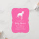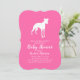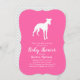 Inclure le grand frère ou la soeur en fourrure bébé dans la célébration avec cet adorable design de baby shower Whippet! Parfait pour un amoureux du chiot avec un bébé en route. Le Whippet est à côté d'une adorable calèche vintage. Le rose en fait un endroit parfait pour une petite fille en route !