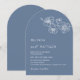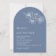 This elegant contemporary arched wedding invitation features white line art flowers and white script on a dusty blue background.