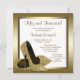 Des femmes élégantes blanc et or 50e anniversaire invitations de fête avec parties scintillant or chaussures talon haut sur un bel arrière - plan or et blanc. Ces belles invitations blanches et dorées à chaussure haute sont facilement customisées pour votre événement en ajoutant simplement vos détails dans le style de police que vous préférez.