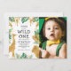 Invités Invitations pour fêter le premier anniversaire de votre enfant avec cette invitation à thème safari jungle, avec une collection de feuillage et d'animaux en faux feuille vert et or (girafe, lion, singe) autour des mots "Wild One" dans la typographie dessinée à la main. Remplacez facilement l'exemple d'image par votre photo préférée du garçon ou de la fille d'anniversaire. Le dos de la carte est orné d'un motif vert et doré de feuillage de la jungle.