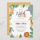 Celebrate the mom-to-be with this adorable “A Little Wild One”safari baby shower invitation! Featuring playful safari animals — a monkey, giraffe, elephant, zebra, and lion — surrounded by lush green leaves. Perfect for a wild one baby shower theme, this design adds a fun and adventurous touch to your celebration. Personalize with your event details for a sweet and stylish safari themed invitation.