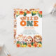 Invitation de 1er anniversaire "Wild one" non sexiste avec un lion, une girafe et un singe mignons entourés de feuilles verts et de fleurs tropicales orange et jaune.