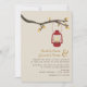 Un faire-part de mariage d'automne en plein air avec un thème sauvage / camping avec une illustration d'une lampe à huile rouge accrochée à une branche d'arbre avec des feuilles orange et marron. Personnalisez le texte avec vos informations.