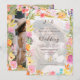 A soft watercolor wildflower frame surrounds your favorite photo, creating a romantic boho garden look with fresh summer color. This two-photo design features delicate hand-painted florals in coral, blush, peach, yellow, and airy blue tones, paired with elegant initials at the top for a personal touch. The layout allows you to showcase a full portrait on the front and a second coordinating image on the back, blending beautifully with outdoor, countryside, vineyard, or backyard celebrations. The semi-transparent overlay keeps text easy to read while letting your love story shine through.