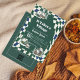 Celebrate the arrival of your little one with this uniquely charming and modern Winter Village Baby Shower Invitation. The design features a stunning dark forest green background contrasted with a whimsical, wavy checkered flag border in cream and deep blue/green. Cozy snow-covered village houses and festive pine trees create a warm, inviting winter scene.
