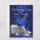 Invitation de fête d'anniversaire en bleu royal et en argent pour femmes avec de jolies chaussures à talon haute en argent, bouteille de parfum et cadeaux sur un bel arrière - plan satin bleu royal. Cette invitation de fête d'anniversaire de famille royale bleu est facilement customisée pour votre événement en ajoutant simplement les détails de votre événement.