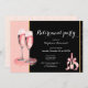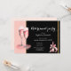 Make her retirement party unforgettable with this stylish and festive invitation design! With a sophisticated two-tone pink & black layout, the left side features a rich pink shade adorned with golden glitters, watercolor champagne glasses, and a bottle that sets the scene for a bubbly celebration. The scripted “Retirement party” adds a touch of glamour and excitement across the card. On the right, the soft pink background offers room for all your personalized party details in a classy script and serif font pairing. The back design continues the elegant theme with a lighter pink base and shimmering glitter details.