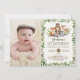 Invitation fantastique du 1er anniversaire illustrant l'illustration de greens d'aquarelles rustiques, de feuillages et d'adorables animaux de la forêt : renards, cerfs, ours et ratons