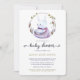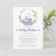 Un crayon fantaisiste et magique, illustration d'une mignonne fille lapin portant une robe rose et violette et tenant une pile de livres, décore cette invitation au baby shower mignonne et élégante pour une future maman et un thème "livres pour bébé".