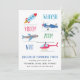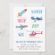Une invitation pour la fête d'anniversaire d'un enfant avec une fusée, un avion, un hélicoptère.