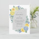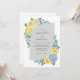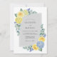 This botanical design features a refreshing palette of sunny yellow roses and soft blue hydrangeas. Delicate sprigs of sage green eucalyptus and navy blue berries add depth and texture to the watercolor arrangement. The soft gray tones create a sophisticated contrast for the vibrant floral clusters. Ideal for a fresh spring or summer nuptial event, the artwork evokes a sense of airy elegance.