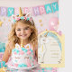Unicorn birthday party. Yellow, pink and turquoise birthday party invitation. Young girl birthday party invite. Rounded. Rainbow. Magical day.