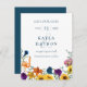 Wedding save-the-date card is beautiful with a colorful garden of sunflowers, tiger lilies and calla lilies. A magenta protea flower and plum purple calla lilies are added for a vibrant Fall floral mix. This fall floral wedding invitation is versatile for indigo, navy blue, plum, orange and gold wedding theme colors.