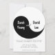 A simple black and white wedding design with the Yin and Yang symbol in the upper part, with the bride name written in white on black (yang, the feminine principle) and the groom name written in black on white (yin, the masculine principle) and the "and" between them written in script, both on black and white.