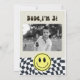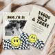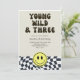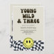 Invitation Wild et trois ans heureux face invitations Cool et amusant enfant Retro thème 3e anniversaire invitation de fête avec des styles rétro Cool avec chèque motif et visage heureuxLe texte dit "jeune, sauvage et trois". Parfait pour la fête d'anniversaire d'un garçon.