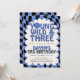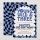 This Young Wild and Three birthday invitation features a trendy retro checkerboard design with cool blue tones and playful typography — perfect for a stylish 3rd birthday party for boys.