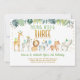 Cette mignonne invitation à l'anniversaire comprend des animaux de safari à l'aquarelle avec des accents de feuilles tropicales et des confettis de feuilles d'or faux.