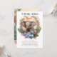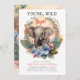 Young Wild Three 3rd Birthday Kids Cute Elephant Invitation Invitation présente un petit éléphant à l'aquarelle mignon et coloré entouré de fleurs tropicales avec le texte "Young, wild and three!" dans le script de typographie moderne. Parfait pour les enfants fêtes de troisième anniversaire. Envoyez par la poste ou téléchargez simplement l'invitation numérique partageable téléchargeable. Conçu par Evco Studio. Pour la coordination des éléments, voir www.zazzle.com/store/evcostudio