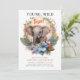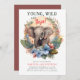 Young Wild Three 3rd Birthday Kids Cute Elephant Invitation Invitation présente un petit éléphant à l'aquarelle mignon et coloré entouré de fleurs tropicales avec le texte "Young, wild and three!" dans le script de typographie moderne. Parfait pour les enfants fêtes de troisième anniversaire. Envoyez par la poste ou téléchargez simplement l'invitation numérique partageable téléchargeable. Conçu par Evco Studio. Pour la coordination des éléments, voir www.zazzle.com/store/evcostudio