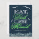 Les invitations de mariage nautique bleu et vert de la Marine — correspondent à la RSVP et plus en bas sur cette page. Complétez votre thème mariage nautique avec ces invitations qui mettent en vedette les oiseaux, les vagues de l'océan au fond et la nouvelle phrase populaire, "Mange, Bois et sois marié". Ce dessin présente un arrière - plan bleu marine (marin) avec quatre oiseaux blancs. Le lettrage est une combinaison de vert citron (Kelly green) et de blanc. Les vagues du fond sont ombragées dans un bleu très clair. Le fond est constitué d'un arrière - plan bleu foncé et d'un cadre d'ondes décoratives blanc assortis pour ajouter de l'éclat. Ces invitations à un mariage sont réglées sur un stock de carte de base de haute qualité; cependant, vous pouvez changer le stock en lin, feutre (gaufré), recyclé et plusieurs teintes métalliques si vous voulez sous le numéro 2 (choisissez votre style, votre taille et votre type de papier) sous le bouton orange ajouter au chariot. Une liste des coûts supplémentaires pour un stock de carte de crédit s'affiche également sous cette option. Chaque invitation est accompagnée d'une enveloppe blanche.