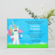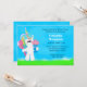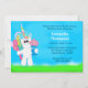Invitation à l'anniversaire de l'enfant avec une Unicorne mignonne tenant de la crème glacée et une cuillère et portant un casquette de fête. L'arrière - plan est l'herbe verte et le ciel bleu. Personnaliser avec les détails de votre fête. graphismes©KristiW