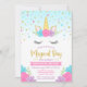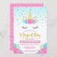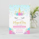 Invitations fantastiques à la fête d'anniversaire de licorne pour une petite fille. Ce design amusant présente une jolie illustration du visage de licorne, des étoiles et des fleurs. Rose tendance, violet, turquoise et une touche de parties scintillant en faux or.