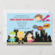 Invitations mignonnes d'anniversaire de super héros pour des garçons avec le garçon superbe et l'arrière - plan de fille et bleu superbe de polka de point.