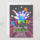 Cartes d'invitation d'anniversaire de bowling avec une boule de bowling frappant les quilles avec des couleurs vives et des étoiles sur un fond sombre qui dit Strike Allons jouer au bowling.