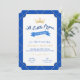 Petite invitation à la douche bébé prince en or brillant et bleu roi profond. "Un Petit Prince est en route" suivi de tous les détails d'un baby shower à thème prince. Des coins fantaisistes, à l'image des tickets, sont parfaits pour un événement royal ! Sur le dos se trouve un motif de couronne doré et bleu.
