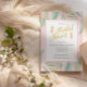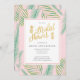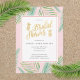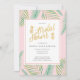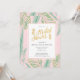 Invitations de douche tropicale élégantes et chic. Doté de frondes de palmier vert, d'accents roses et d'un texte "Fête des mariées" en or avec ananas. Veuillez noter que les éléments métalliques seront imprimés pour ressembler à de la feuille d'or, mais les invitations ne contiendront pas de feuille d'or, de parties scintillant ou d'encre métallique.