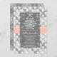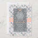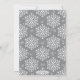 Une belle douche nuptiale à thème ou une invitation wedding shower avec un damas doux, gris et blanc, une bordure florale et un flocon de neige avec un motif imprimé en ruban rosé. Un joli flocon de neige blanc attaché par un délicat arc rose pâle est accroché au sommet de la carte avec des reflets de neige en forme de coeur. L'arrière du invitation est recouvert d'un coeur et d'un motif de flocon de neige qui se répètent. Oeuvre © Chrissy H. Studios, LLC. Tous droits réservés.