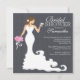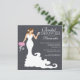 L'élégante invitation à la wedding shower de mariée moderne et moderne présente une mariée chic et moderne en train de déguster un verre de vin tout en tenant un magnifique bouquet de fleurs de mariage roses posé sur un papier populaire arrière - plan de lin noir avec un texte blanc remarquable. Notre invitation moderne à la douche de mariée est parfaite pour une fête populaire de la douche de la mariée. Visitez notre boutique pour voir cette belle invitation à la douche nuptiale dans une large sélection de couleurs de bouquet floral et différentes variations de mariées.