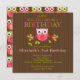 Commencez votre fête d'anniversaire avec nos adorables invitations aux anniversaires de enfants de choux roses et rouges. Notre invitation aux chouettes est doté d'une jolie petite chouette assise sur une branche de feuilles vertes et fleurie, et est posée sur un arrière - plan brun et élégant. L'invitation pour la fête d'anniversaire des chouettes filles est faite par un arrière - plan motif unique. Visitez notre boutique pour trouver des cartes de remerciement, des autocollants d'anniversaire, des autocollants de remerciement et des timbres-poste assortis. © Petit Tatti