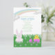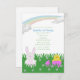 Pâques/invitations mignonnes fête d'anniversaire avec un lapin adorable mignon et un poussin doux de bébé se reposant dans un domaine d'herbe verte et de jolies fleurs, avec un bel arc-en-ciel au-dessus.