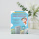 Une invitation à la fête d'anniversaires de enfants mignonne et colorée pour cette fête d'anniversaire à thème super-héros ! Le design est du point de vue d'un oeil d'oiseau avec un mignon garçon super-héros en tenue de super-héros rouge et jaune volant au-dessus du paysage urbain de grands bâtiments et allant vers les nuages! Personnalisez facilement avec les détails de votre fête, y compris la lettre initiale sur l'tenue de héros du garçon.