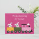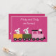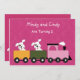 Mignonnes chiots avec un cercle autour d'un oeil. Des chiots jumeaux roulent dans un train rose. Parfait pour les invitations d'anniversaire jumeaux. Convient aux filles, customisez avec les détails de votre fête.