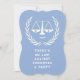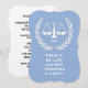 Invitations de la fête d'avocat avec des échelles créatives de justice et une citation drôle pour la fête de fin d'études de droit ou fête d'anniversaire.